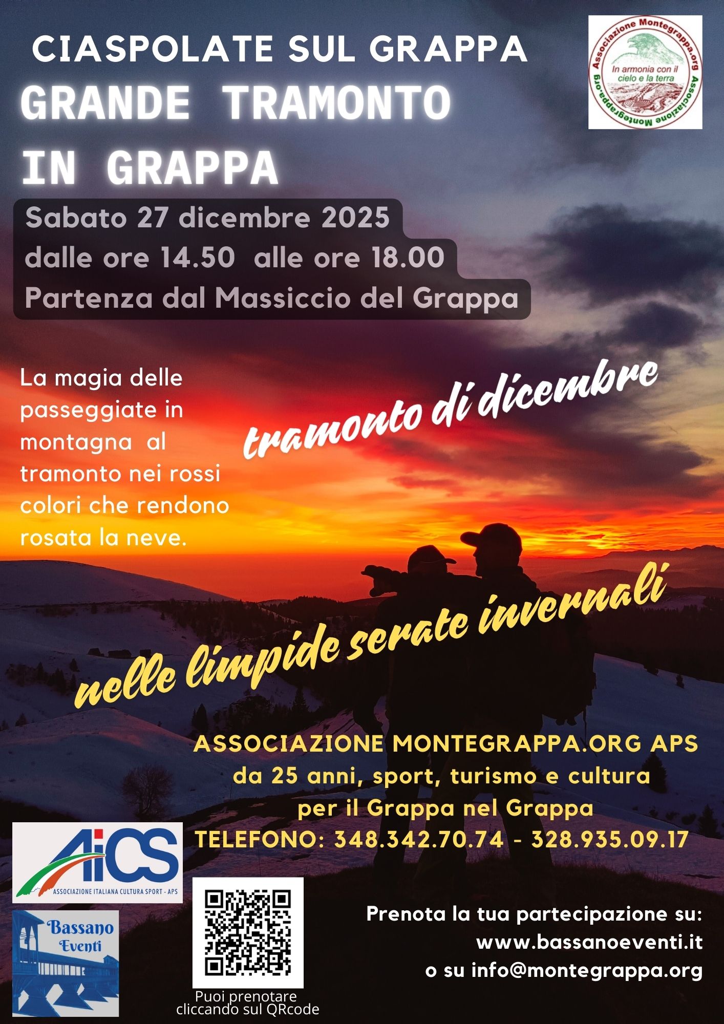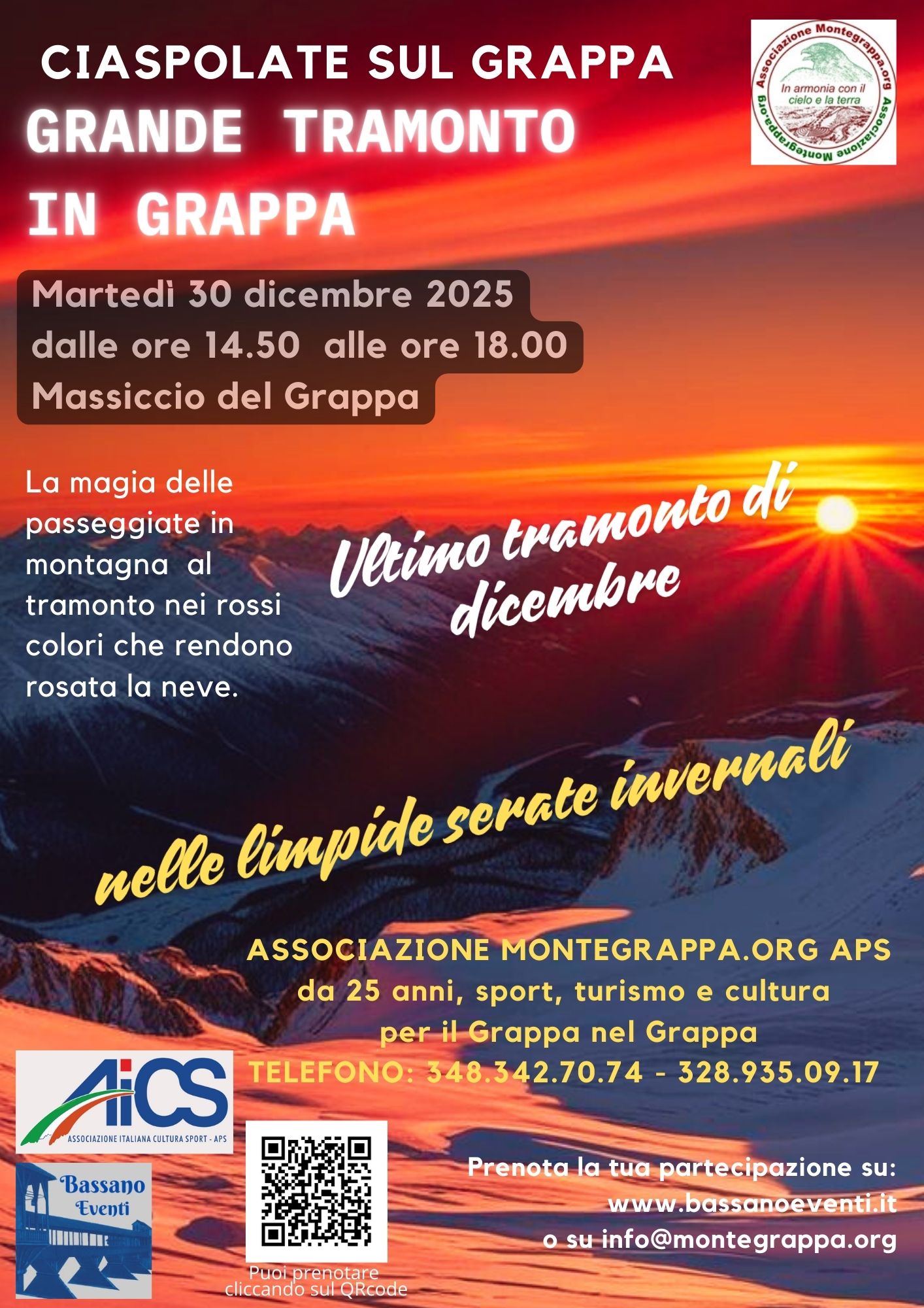 Sabato 20 dicembre 2025, interessante camminata in Grappa al tramonto in questo periodo dell'anno a -1 dal solstizio d'inverno con le giornate cortissime, possiamo chiamarla la camminata del giorno più corto dell'anno. La camminata al tramonto in Grappa ci porterà ad ammirare il tramonto dalla cima del Col del Miglio che con i suoi 1350 metri rivolto completamente a ovest ci darà un'immagine stupenda del tramonto del sole sull'Altopiano dei Sette Comuni. L'esperienza di camminare al tramonto in montagna è sempre una bellissima avventura e quindi vi porteremo a camminare nella zona ovest del Grappa e saliremo nella quota più alta dei colli alti per poter godere al meglio il tramonto del sole sulle montagne dell'altopiano di Asiago. Per noi dell'associazione che amiamo particolarmente questo genere di uscite è sempre una bellissima occasione per poter rinnovare negli anni questo sublime esaltazione di caldi colori emanati dal sole morente nelle terse serate invernali. Come dicevano gli antichi Egizi è un momento magico in cui il sole scende nella "Duat", si rinnova e si fortifica per essere nuovamente vivificante e far nascere un nuovo giorno. In definitiva il tramonto è una fase della vita ed è essenziale per il rinnovamento della stessa.