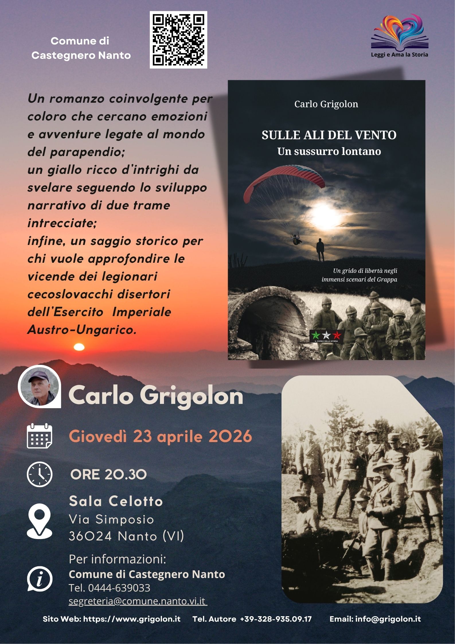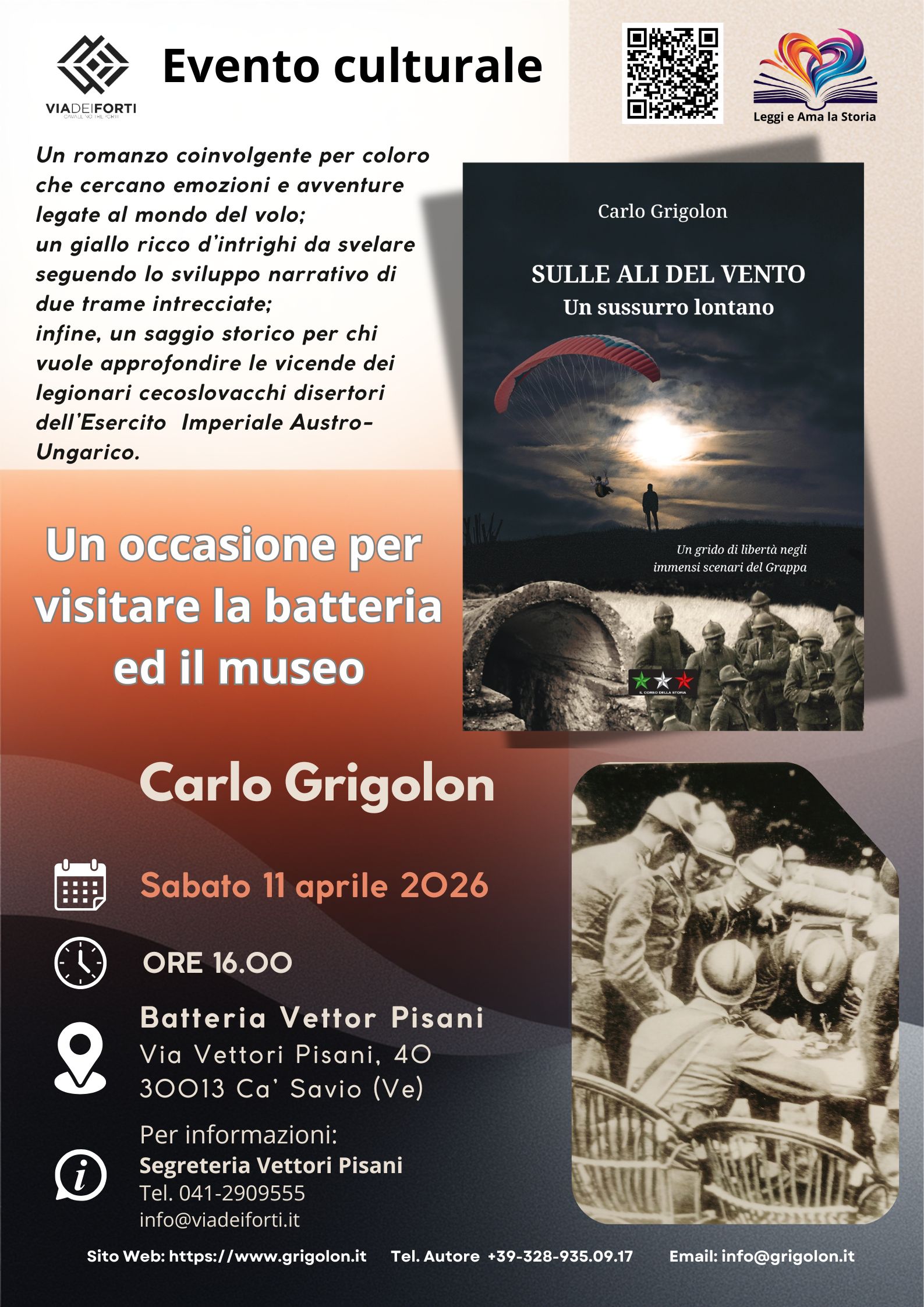 Nella serata di Venerdì 6 marzo 2026, alle ore 20.30, l'autore Carlo Grigolon presenterà il libro "Sulle ali del vento" presso l'Auditorium Comunale di Meduna di Livenza. Si tratta di un’opportunità significativa per incontrare l’autore e acquistare una copia autografata dell’opera.