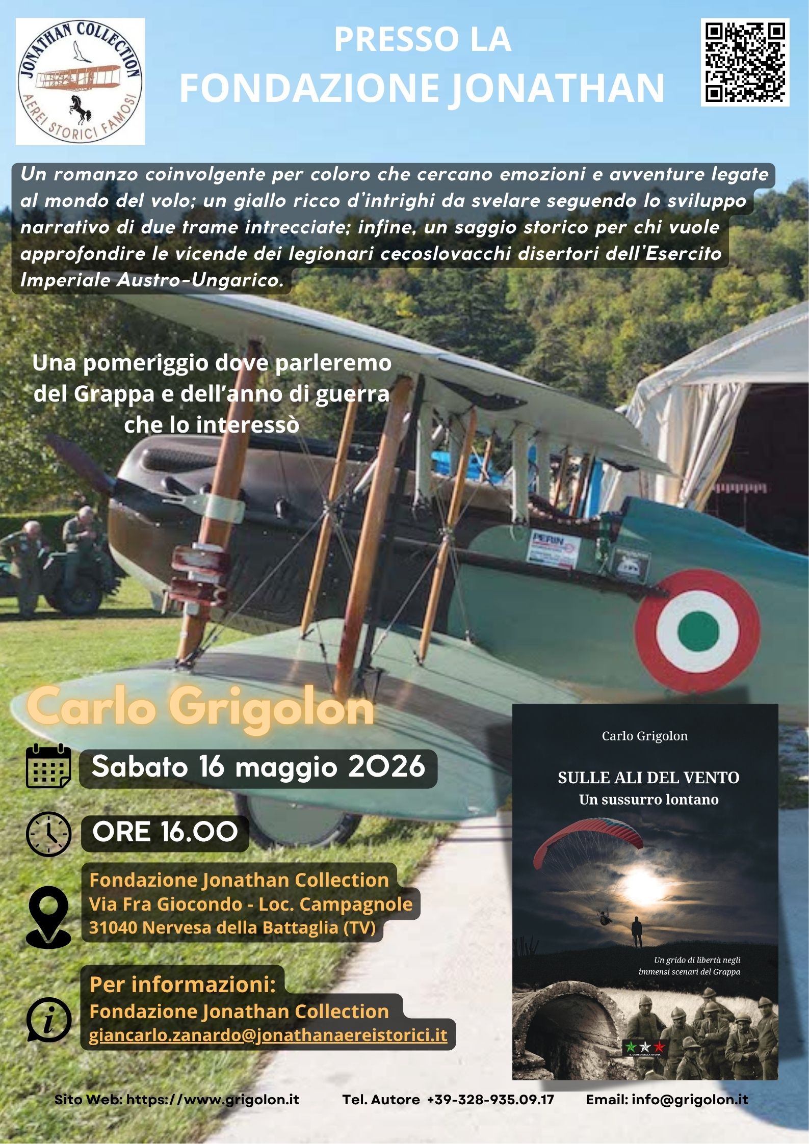Nel pomeriggio di sabato 16 maggio 2026, alle ore 18.00 nella stupenda cornice dell'avio superfice della Fondazione Jonathan di Nervesa della Battaglia, l'autore Carlo Grigolon presenterà il libro "Sulle ali del vento". Una location eccezzionale per questo evento! Per tutto ciò devo ringraziare il presidente Giancarlo Zanardo della Fondazione e lo staff di piloti che da sempre sono vicini alla nostra associazione. Non mancate quindi a questo appuntamento, per avere anche la possibilità di visitare la raccolta unica in Italia di aerei d'epoca della Grande Guerra.