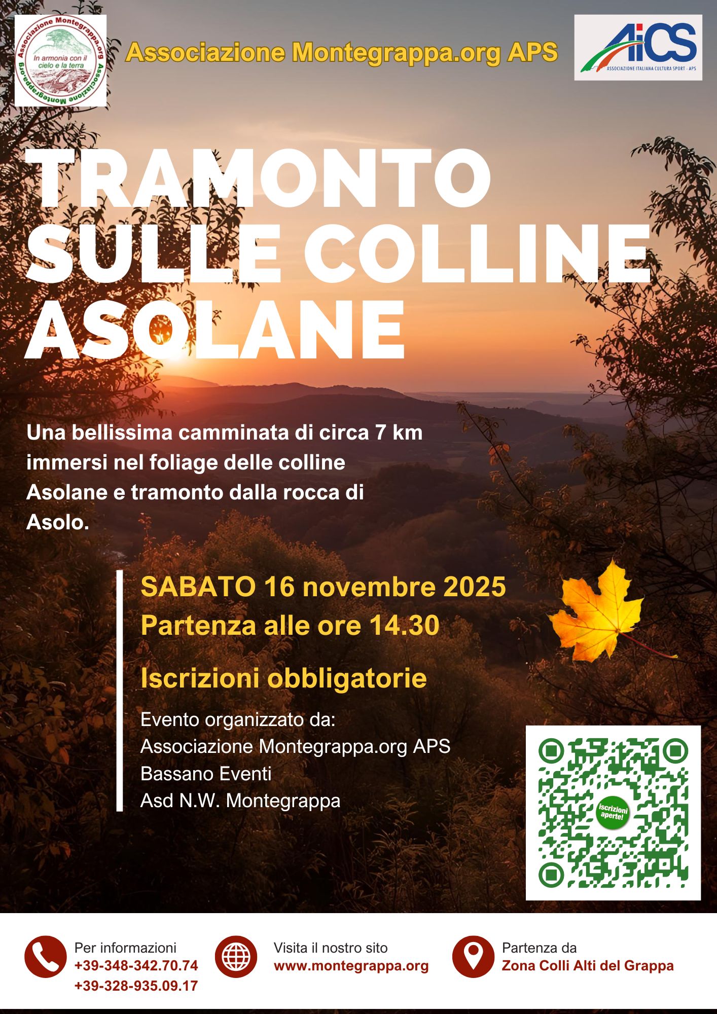 Un'uscita nei colori autunnali delle colline Asolane per camminare tra le foglie morte nei colori del foliage; la effettueremo sulle colline Asolane nella zona di Asolo e potremo assistere al tramonto dalla Rocca di Asolo, punto panoramico eccezionale per ammirare il tramonto. L'abbiamo programmata per il pomeriggio di sabato 15 novembre 2025. Proponiamo questa esperienza unica che integra diversi aspetti. Da un lato, l'aspetto naturalistico del foliage, con scenari e panorami incantevoli, permetterà di camminare immersi nei colori autunnali delle colline, caratterizzati da particolari sfumature cromatiche. Dall'altro lato, avremo la possibilità di esplorare questa zona nel pomeriggio e assistere a un bellissimo tramonto autunnale che accentuerà i già stupendi colori caldi di questo periodo dell'anno. La nostra camminata avrà una durata complessiva di 3 ore circa e ci condurrà ad ammirare i meravigliosi colori del foliage autunnale delle nostre stupende colline.